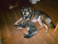 It's Puppy love!! Or is that Kitty love? Either way, these two are almost inseporable! They play together all the time and even cuddle up. They've both sure grown. Abby can fit this cats entire head in her mouth!! Playing of course.