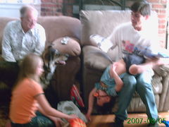 This one is kind of bright. My dad, Katie, Abby, Rob and Tristan are enjoying Tristan's 6th birthday party.